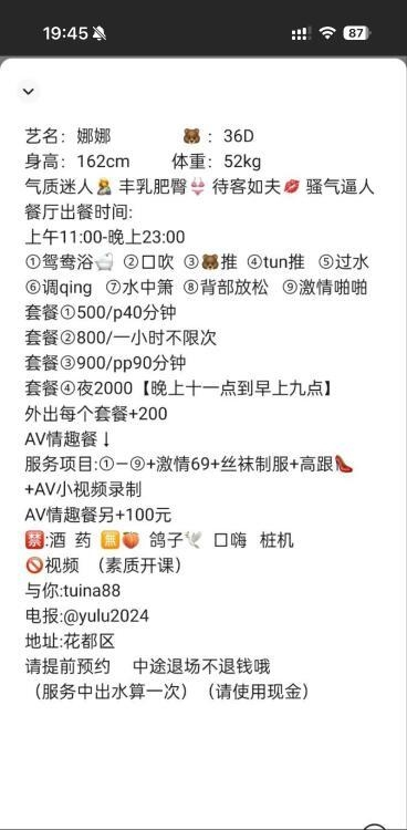 站长提醒:参考如下攻略防范骗子 1、所有没有见到面就提前要求付款(索取定金、红包、路费、保证金等)的都是骗子! 2、进入场所后没有提供具体服务就一直推荐办卡,并且对服务项目含糊其辞的都是骗子! 3、所有在帖子或者回复中出售VIP、楼凤联系方式等的都是骗子 4、如果你加上了骗子的微信或QQ,请在删除之前先举报一波 ※微信、QQ搜索异常属于正常现象,加的人越多越容易被限制。如若联系方式全部失效的,请在下方留言,会有工作人员审核后,退还金币。